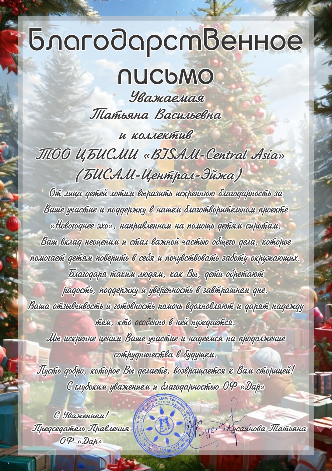 In the run-up to the New Year holidays, BISAM provided support to the Dar and Teplo charitable foundations. The company's funds were used to purchase New Year's gifts and food for low-income families.